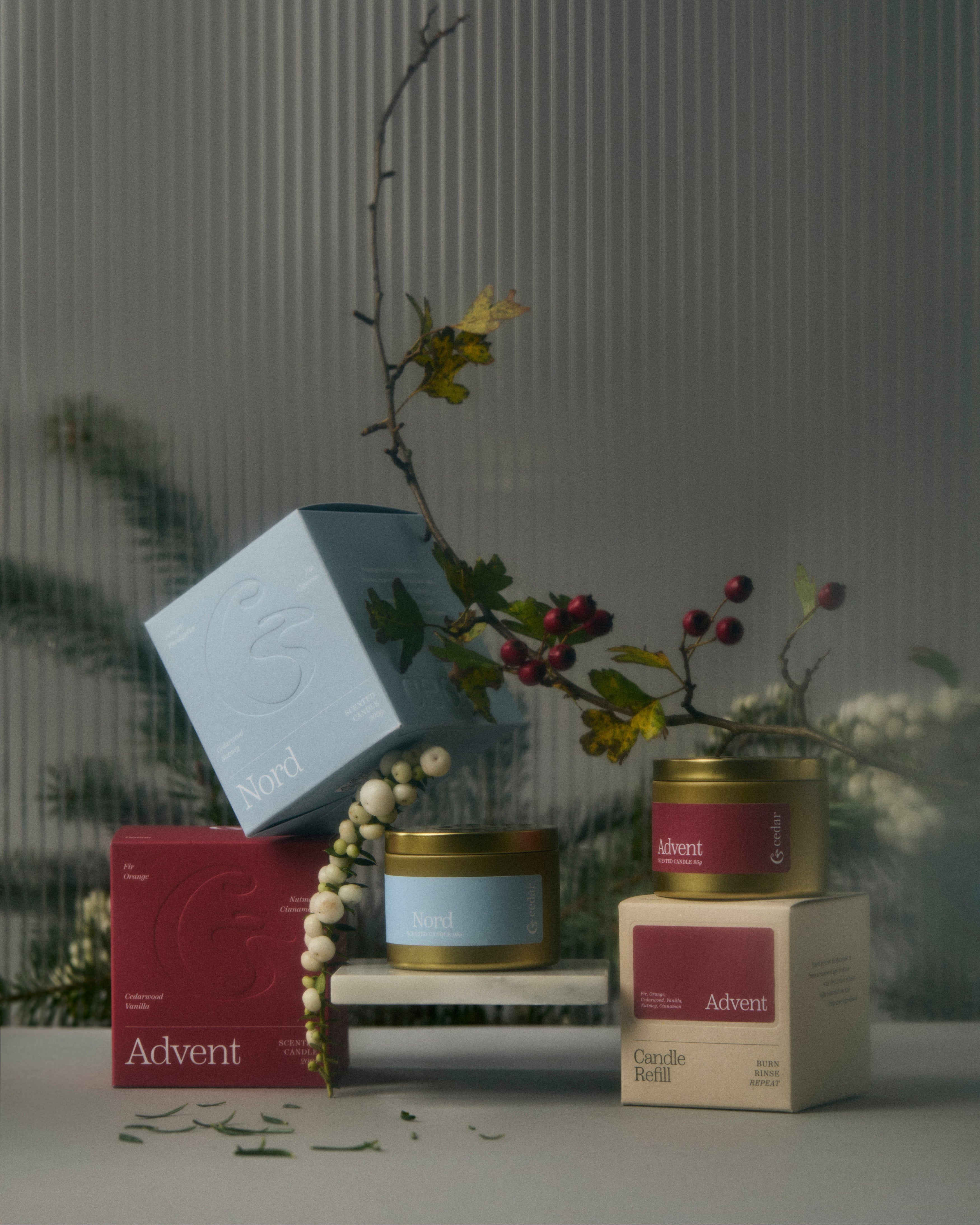 Two winter fragrances to suit every mood — Nord is crisp and restorative, inspired by alpine forests and clear cold air; Advent is warm and spiced, evoking slow evenings and fireside comfort.